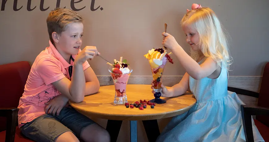 Zum Kaffeetrinken punkten wir mit selbstgemachtem Eis (natürlich auch zum Mitnehmen) und mit unserem großen Kuchen- und Konditorei-Angebot.